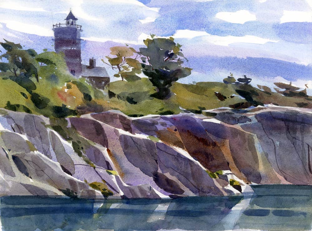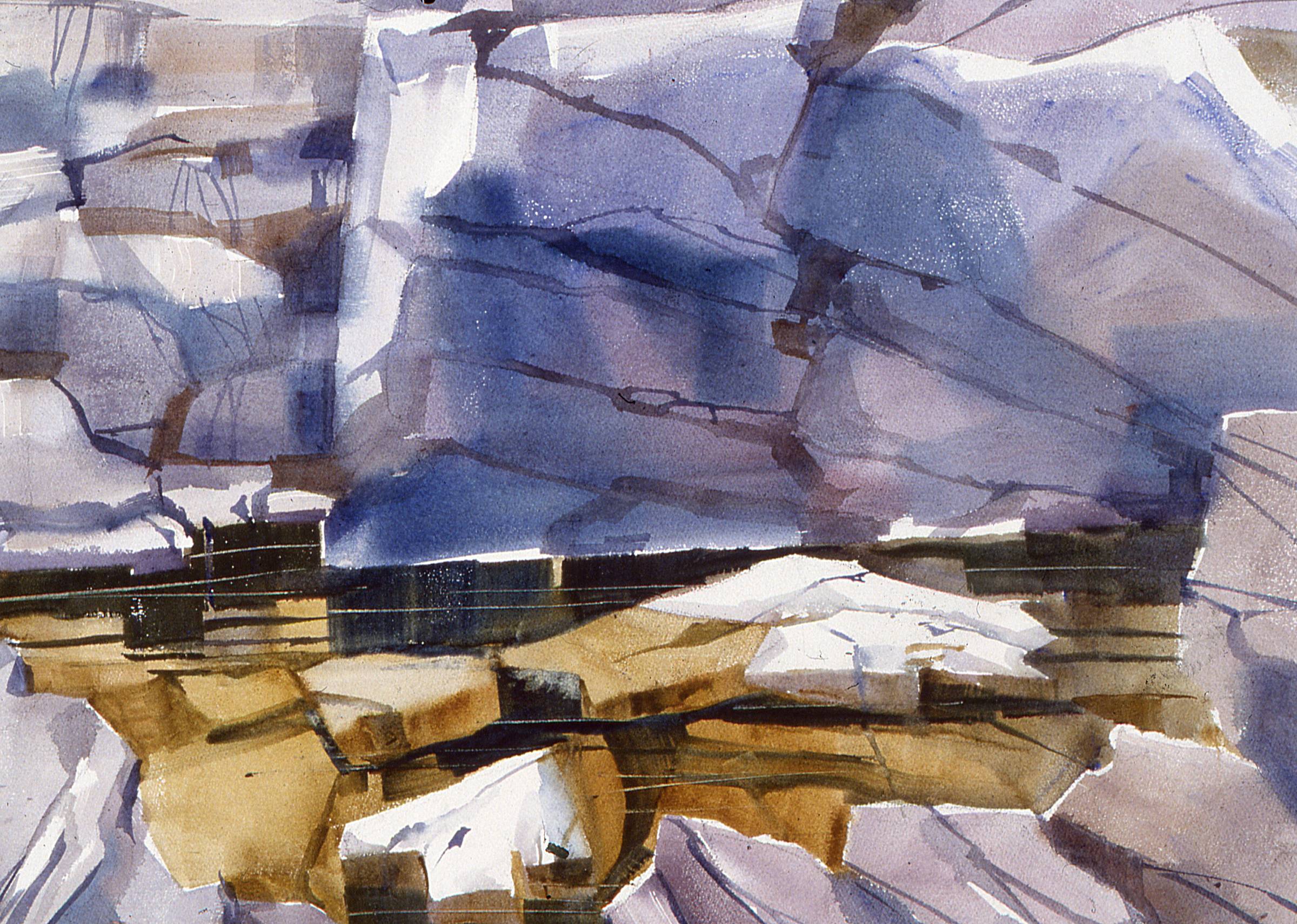 I don’t remember where this quarry was, but I do remember my early fascination with its sharp granite edges, deep pools and watery reflections. As I soon realized—especially when painting on a large sheet—time seems to stop and you get lost in the experience.