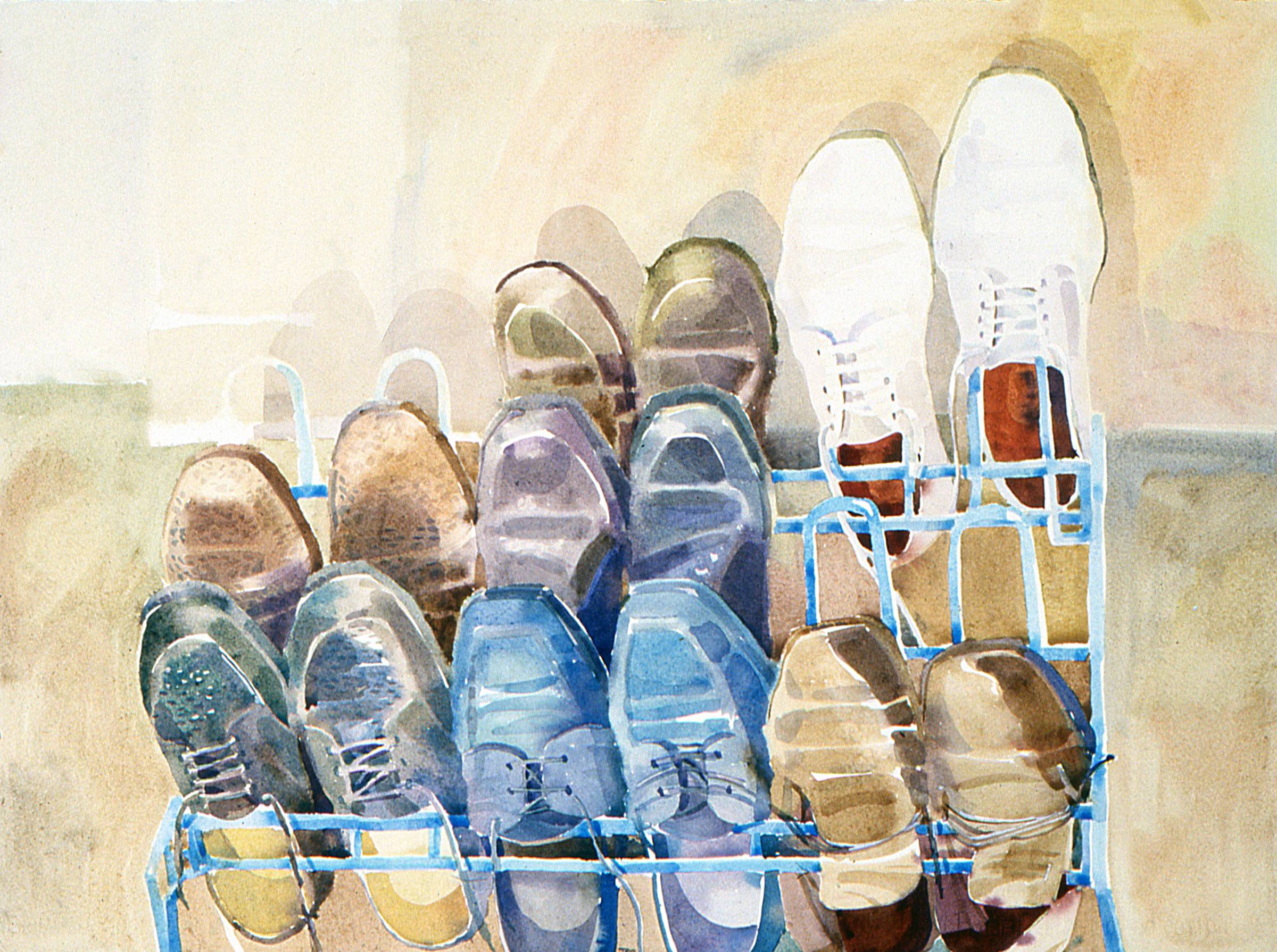 In 1991, soon after the birth of our first son, I had a solo exhibition called “Housebound.” The subjects were intimate scenes from around the house—piles of laundry, a shirt waiting to be ironed, a worn leather bag, men’s shoes on a rack… With a young baby at home, I don’t know how I ever managed to paint them all. With lots of help from family, I guess. My Grumbacher flat came in handy for the edges on the worn leather and looping shoe rack.
