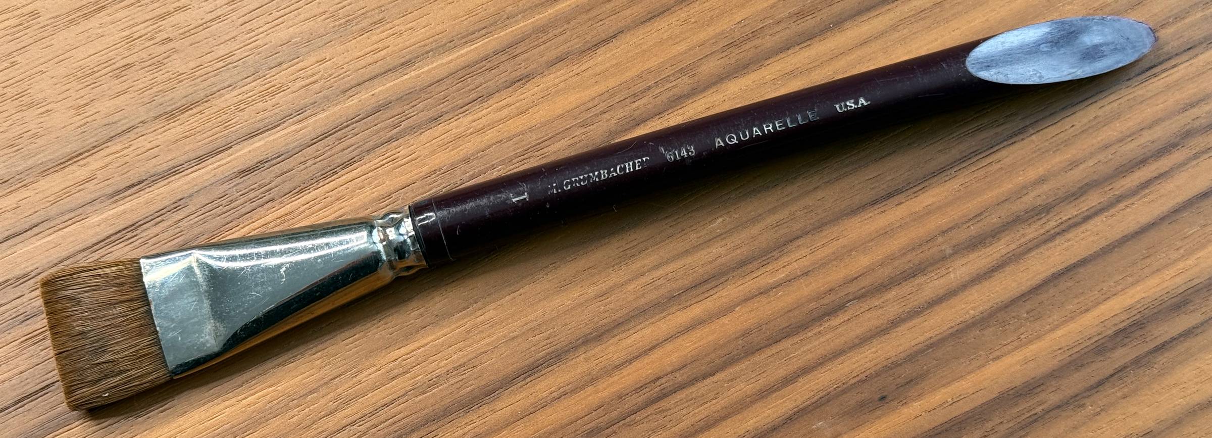 I often credit the late Edgar A. Whitney, my first great watercolour teacher, for his impact on how I think about and practice watercolour painting. But have I ever mentioned his wonky invention, the double-ended brush? It’s the Whitney Rotary, fitted with a flat and round brush at either end. I’m sure it’s a collector’s item, if you’re into that sort of thing.
