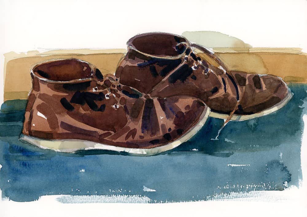 Thirty years later, our first-born came home for a visit and left his boots by the door, no doubt in search of leftovers in the fridge. I remember liking the placement of the shoes so much that I dragged a chair into our powder room to paint them exactly as they had been kicked off.
