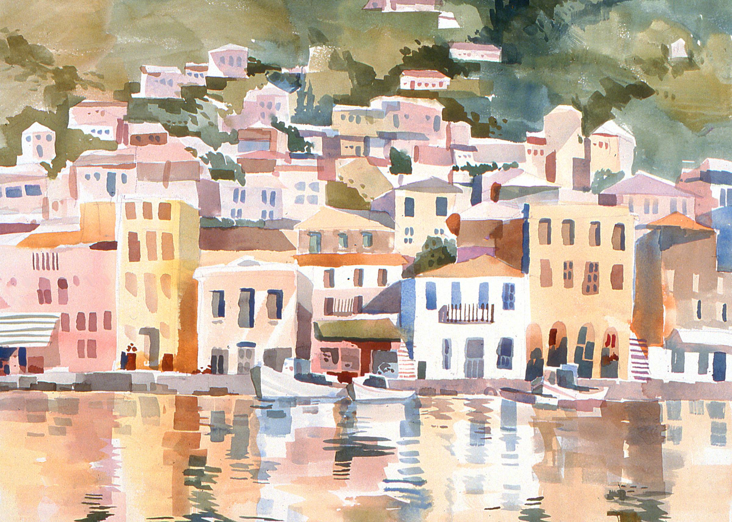 I can’t believe that, all those years ago, I lugged full sheets of watercolour paper with me to Greece. But I did (I was young and reckless). My husband reminded me that I was sitting on a folding stool, facing Gythio harbour, and painting this full sheet with a 2-inch flat.