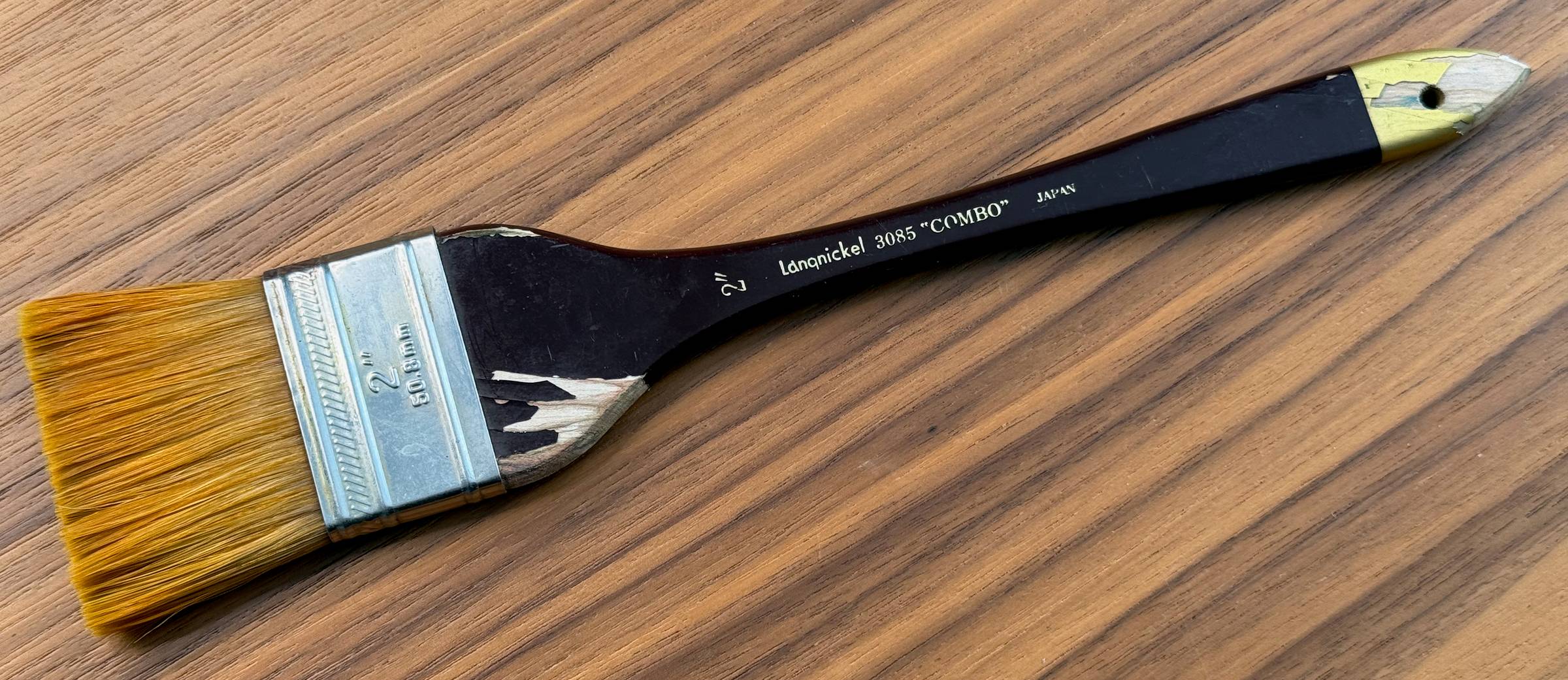 Paint and scrape, paint and scrape. That’s what a brush with an angled handle allows you to do. I can’t remember where this beauty came from, but it still feels like a million bucks when I paint with it. It holds lots of wash, is great for painting edges, and has the added bonus of that angled handle for scraping tree branches and other lines into wet paint.